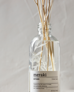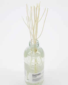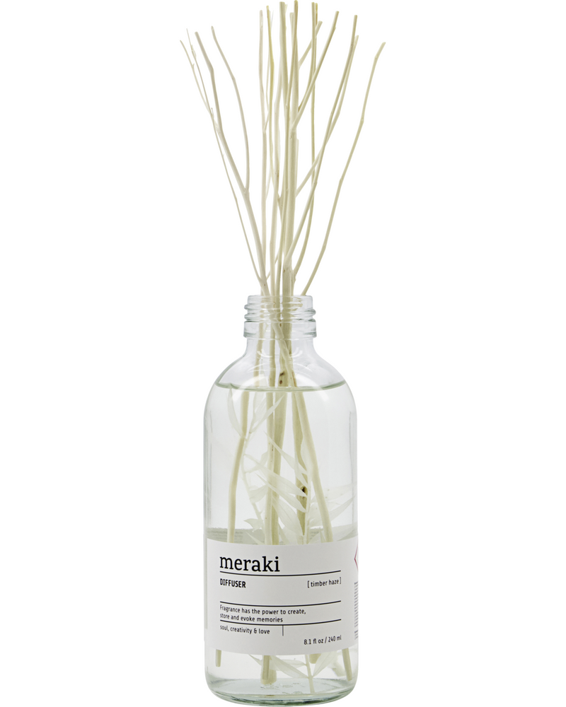 Add a light, fruity floral scent to your home with Timber Haze, a diffuser from Meraki. With notes of green citrus and flowers like rose, geranium and jasmine, it helps create an uplifting and vibrant atmosphere. Like stepping into a blooming garden. The rattan sticks absorb the liquid and diffuse the scent throughout the room. Composed of a clear bottle and a decorative butcher's broom branch inside, the diffuser adds a light, feminine touch to your bathroom, hallway or living room. Depending on how many branches you use at once, the diffuser will last about 4 to 6 months.