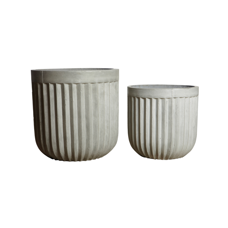 Create a summery atmosphere on the terrace with stunning flower pots. Concrete by House Doctor consists of two outdoor pots made of concrete in a beautiful light grey shade. The two pots are available in two sizes and have a beautiful ribbed pattern that brings a wonderful atmosphere to your terrace or front door. Place the pots together in small groups or create an atmospheric corner with colourful summer flowers or green plants. The pots are frost-proof and have holes in the bottom so that the water can drain away when it rains.