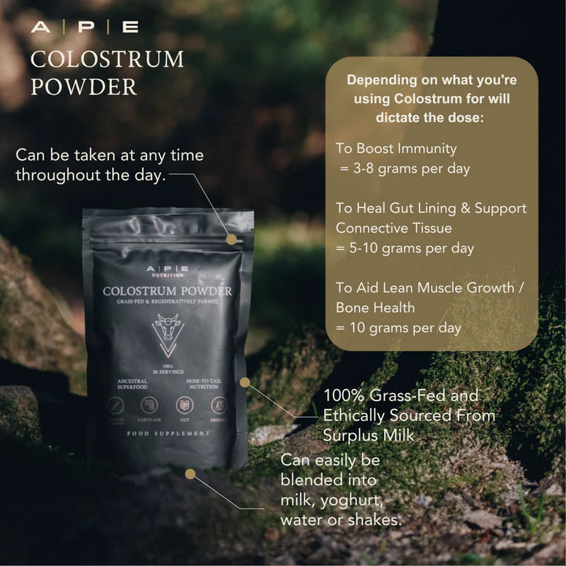 Grass-Fed Colostrum von APE Nutrition ist ein natürliches, hochwirksames Supplement, gewonnen aus der „Erstmilch“ von Rindern, die direkt nach der Geburt produziert wird, um das Immunsystem des Kalbes zu stärken und Wachstum zu fördern. Unser Colostrum stammt von grass-fed, regenerativ aufgezogenen Rindern und wird ethisch gewonnen, nachdem das Kalb vollständig genährt ist. Durch schonendes Sprühtrocknen entsteht ein Pulver voller Nährstoffe, Peptide und Wachstumsfaktoren, das die Immunität, den Muskel- und Bindegewebswachstum, Darm- und Hautgesundheit unterstützt.