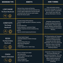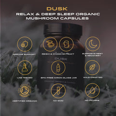 Dusk enthält 8:1 Extrakte von Reishi- und Chaga-Pilzen, wildgeerntet und biologisch. Die Kapseln unterstützen das zentrale Nervensystem, fördern erholsamen Schlaf und liefern starke Antioxidantien. Ideal für stressgeplagte Menschen und alle, die Entspannung, Regeneration und Zellschutz suchen.