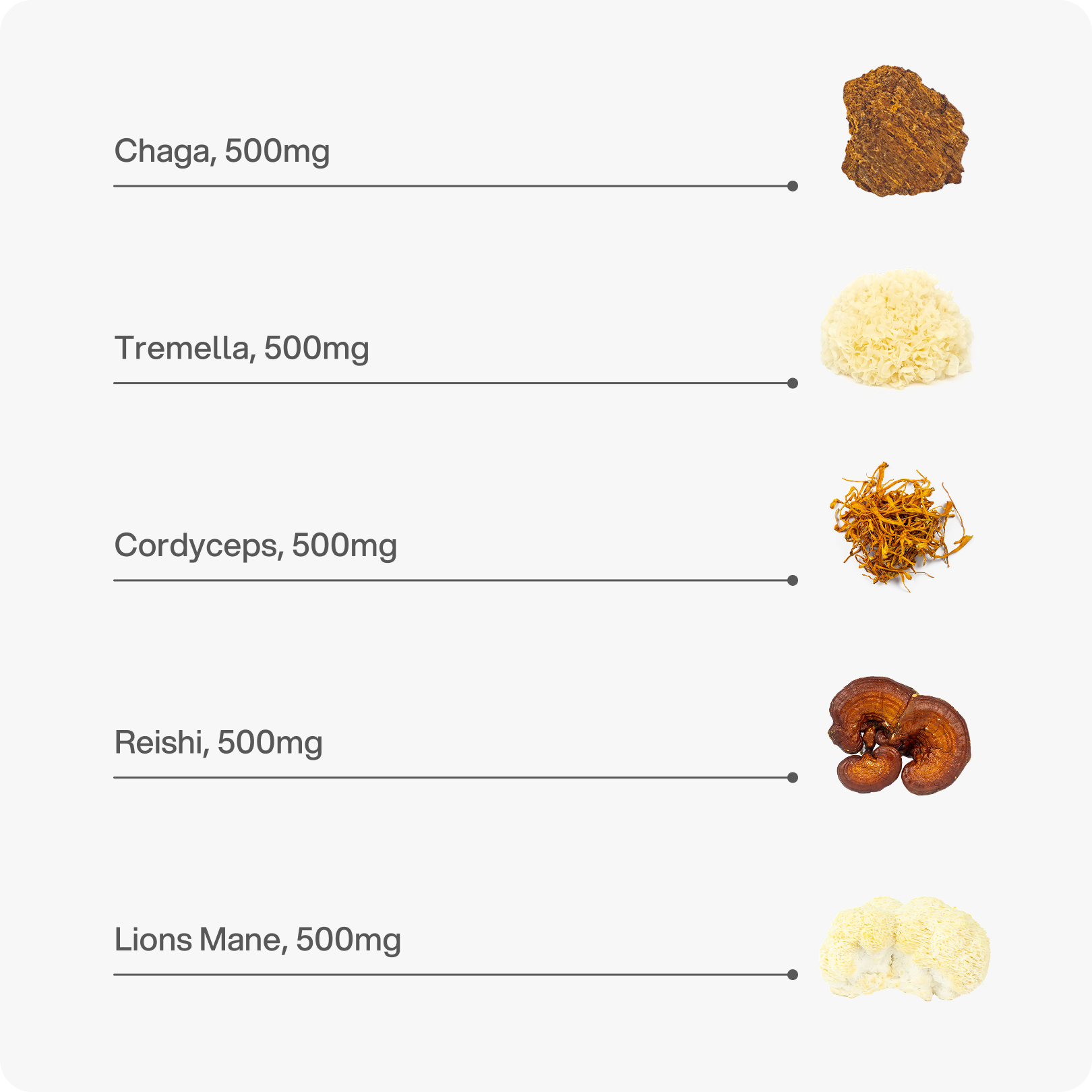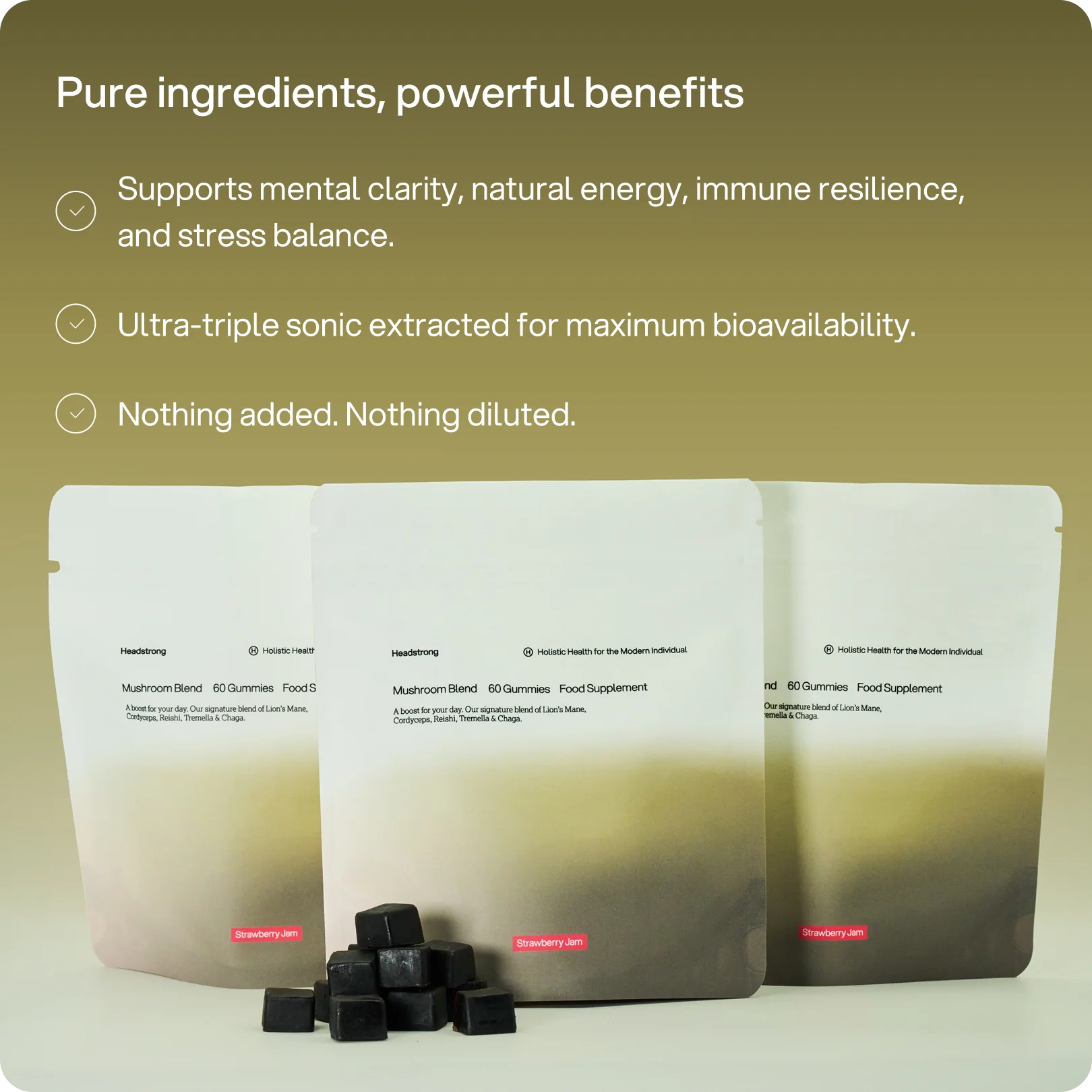 Die Mushroom Blend Gummies von HEADSTRONG vereinen fünf funktionelle Pilze in einer Gummidose: Lion’s Mane, Reishi, Cordyceps, Chaga und Tremella – alle triple-ultrasonic extrahiert für maximale Bioverfügbarkeit. Jede Portion unterstützt mentale Klarheit, nachhaltige Energie, Stressresistenz, Immunabwehr und Hautfeuchtigkeit – alles in einer täglichen Dosis.