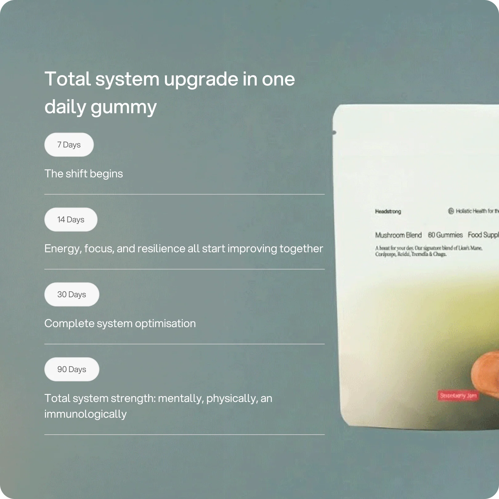 Einfach 2 Gummies täglich einnehmen – für einen systemweiten Boost von Geist, Körper und Immunität.